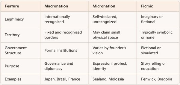 The spectrum from macronations to ficmics reflects a rich tapestry of human imagination, identity, and resistance. While macronations define global order, micronations and ficmics challenge those conventions, offering alternative views of what sovereignty, citizenship, and nationhood can mean. They remind us that while land and law may bind official borders, the idea of a “nation” lives just as powerfully in imagination and community.